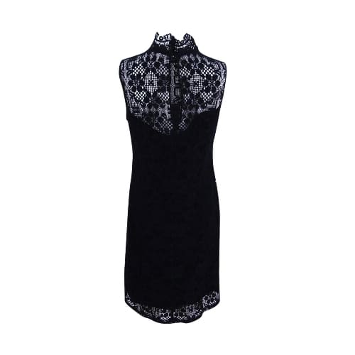 A sophisticated sheath dress featuring a lace mock-neck, perfect for formal events or as a polished office ensemble.